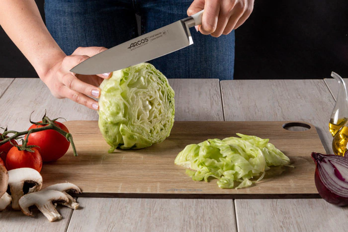 El cuchillo Cocinero Serie Riviera Blanc 200 mm está fabricado para ofrecer una mayor capacidad de corte. Gracias a su hoja ancha y estable forjada de acero inoxidable NITRUM® podrás tener una herramienta versátil para picar y trocear diversidad de carnes y verduras.